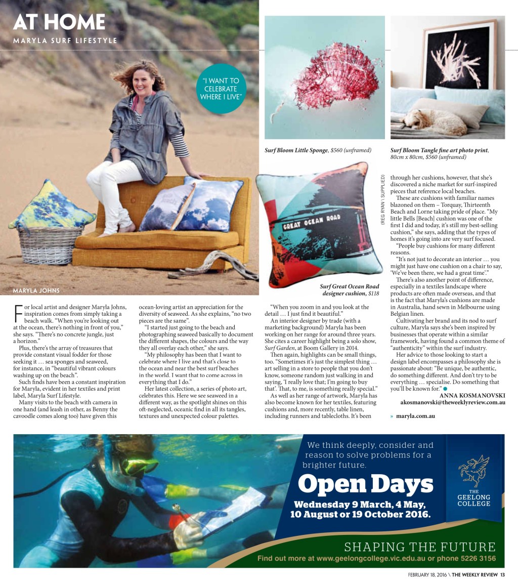 Feature article on Maryla Johns, the artist and designer behind Maryla Surf Lifestyle, published in The Weekly Review Greater Geelong, 18th Feb 2016.